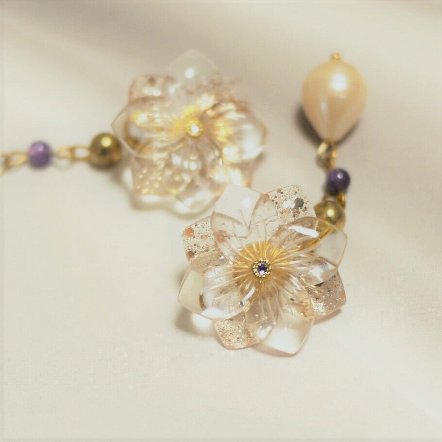 中心のパープルの輝きと、揺れるピンクパールがアクセントです。